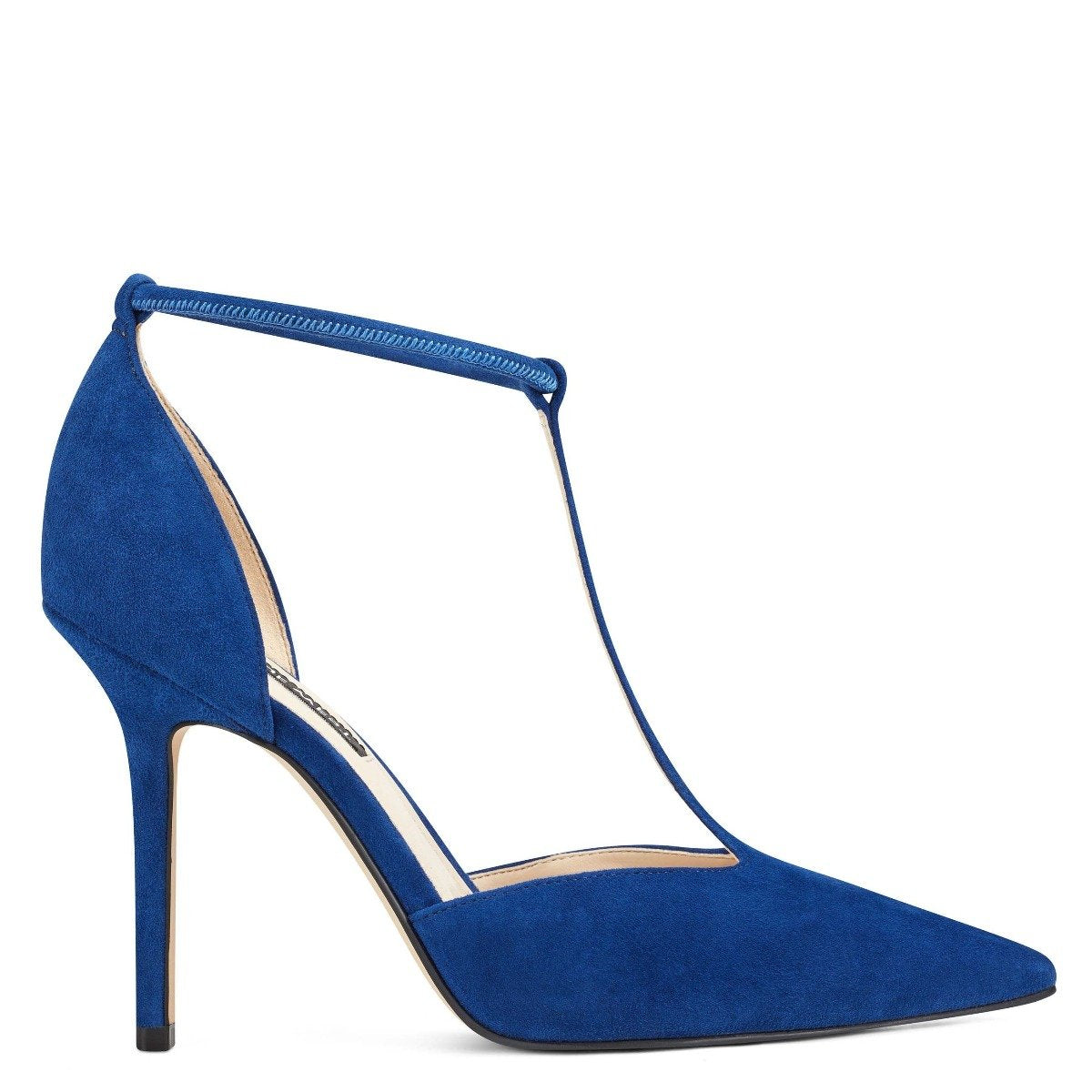 A slender T-strap descends dramatically from the buckle-detailed ankle strap to the pointy toe of our Breezy pump styled with open sides, perched on a towering 3.94" heel.