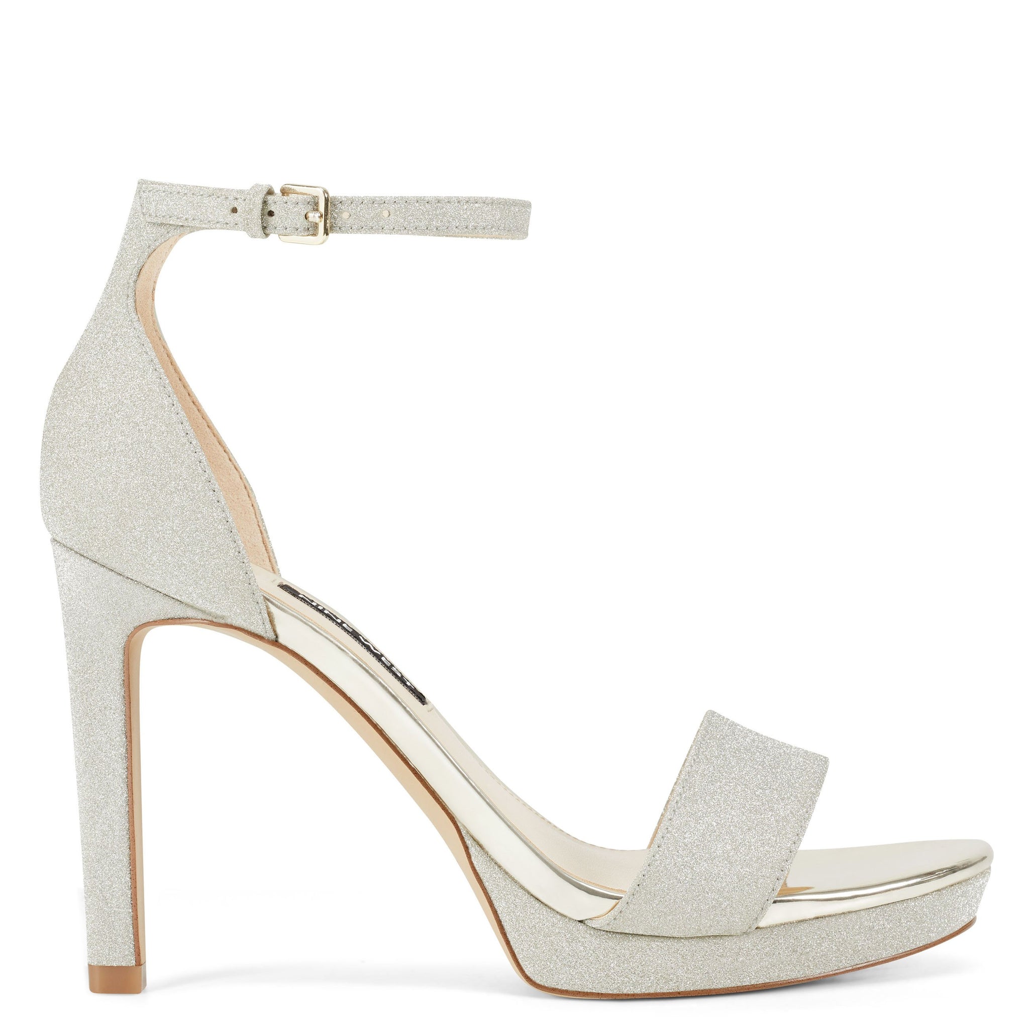 Slender straps at the toe and ankle define the barely there look of this must-have sandal lifted by a classic heel.