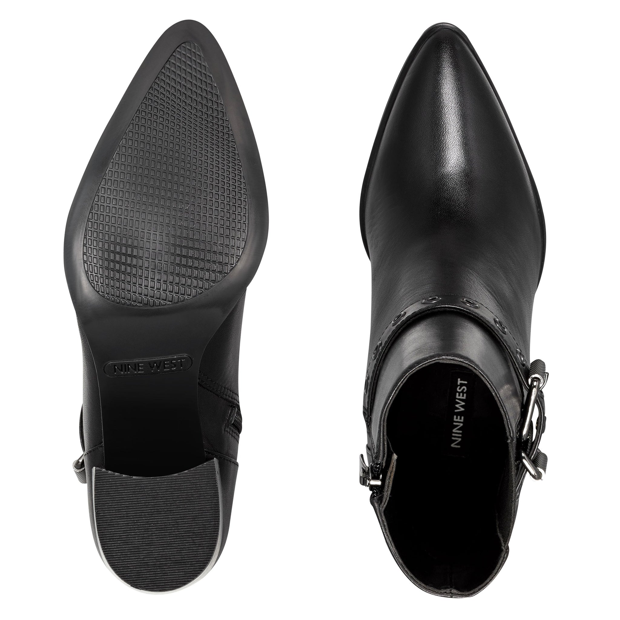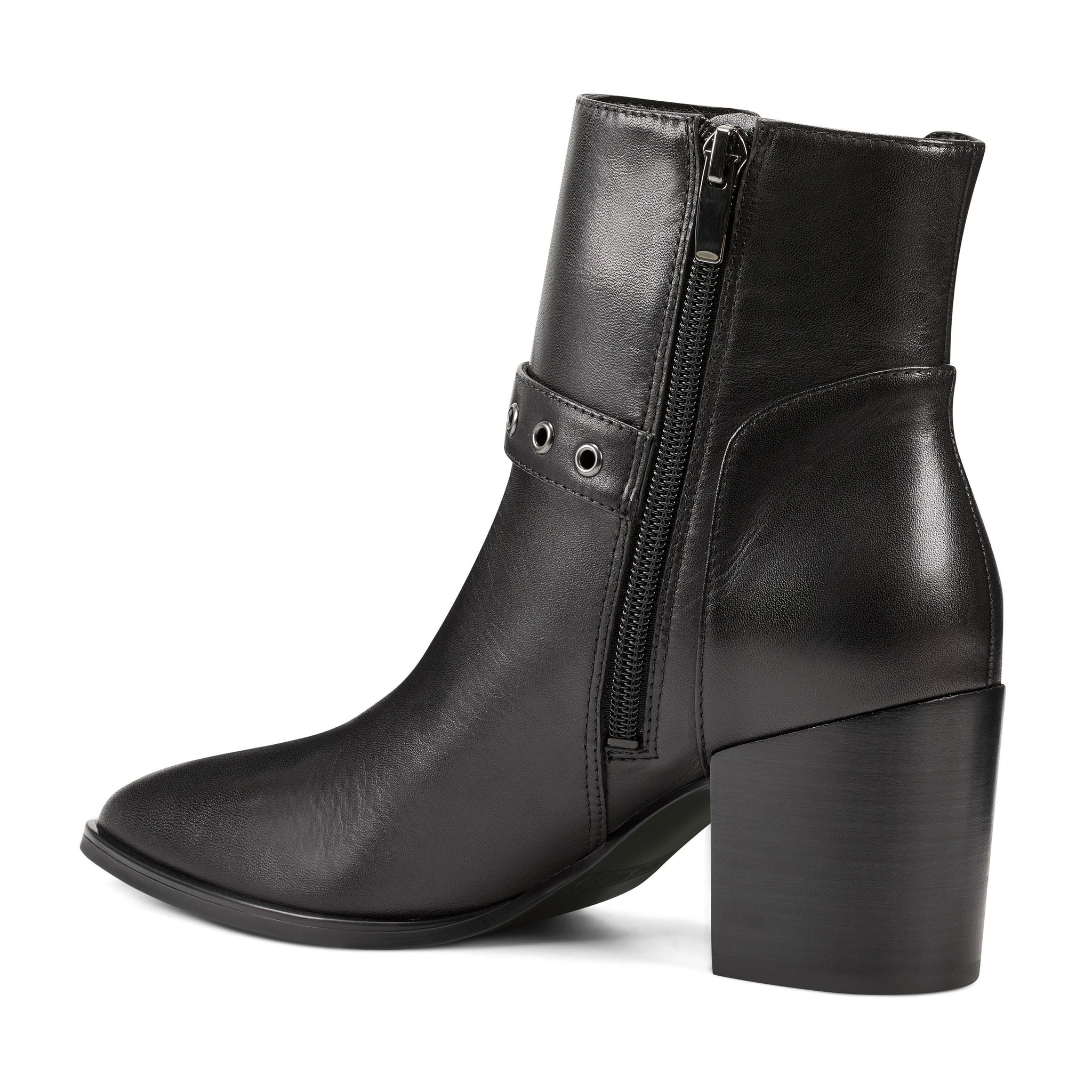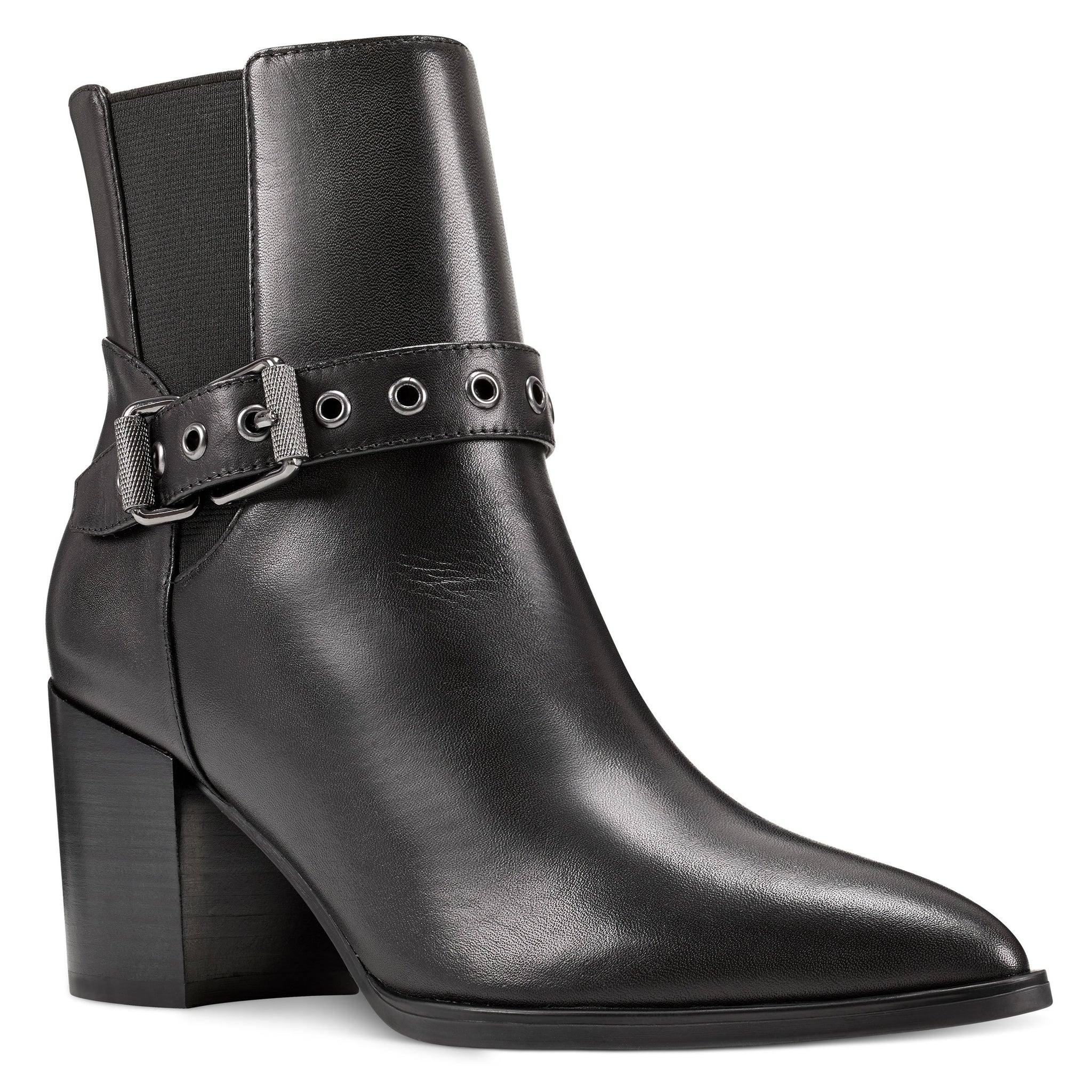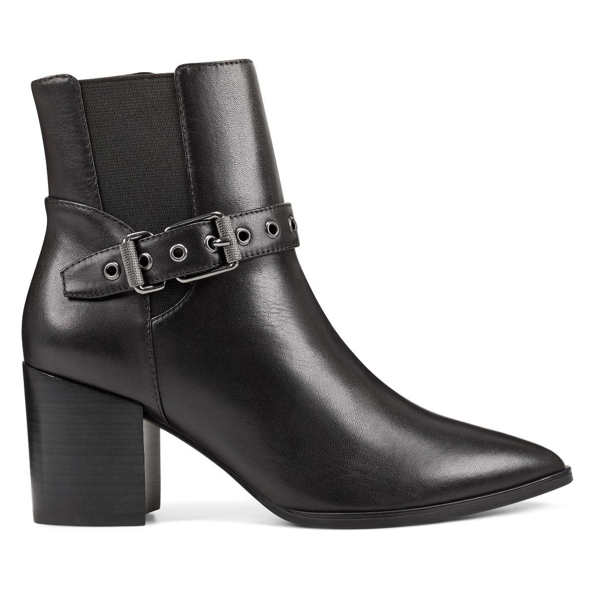 A beautifully rounded toe is counterbalanced by Giah's faux buckle ankle strap. Elastic goring makes it easy to slip Giah on and off.