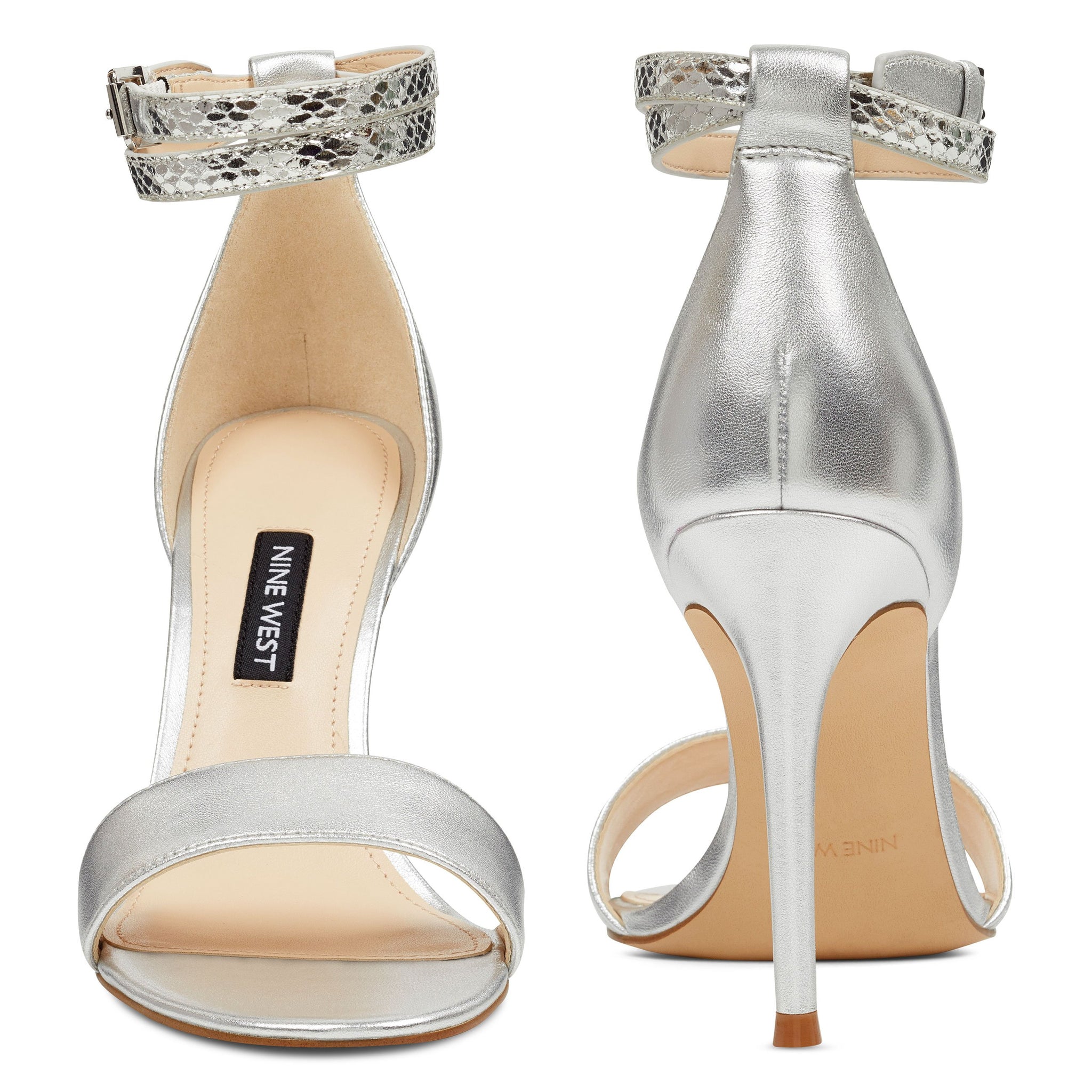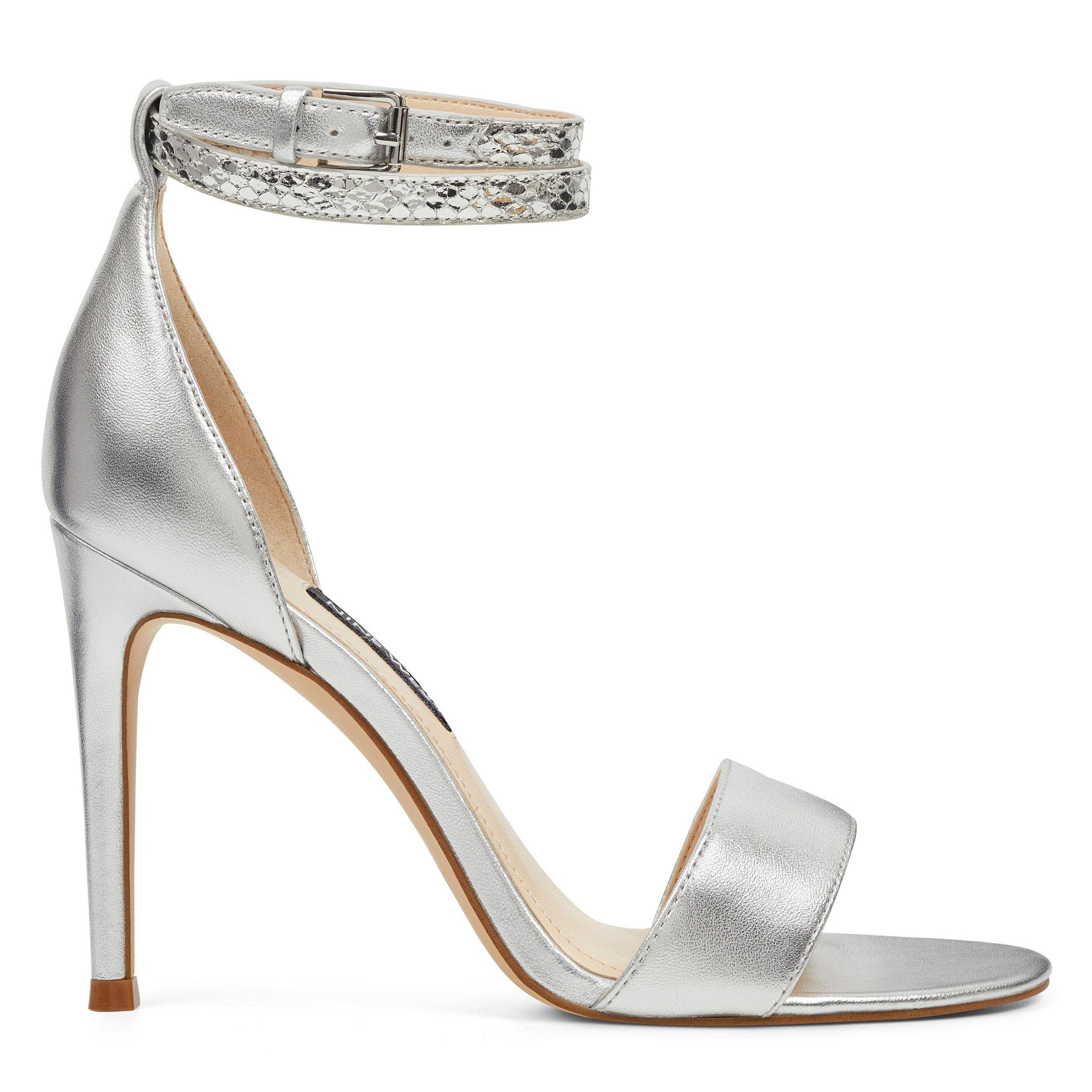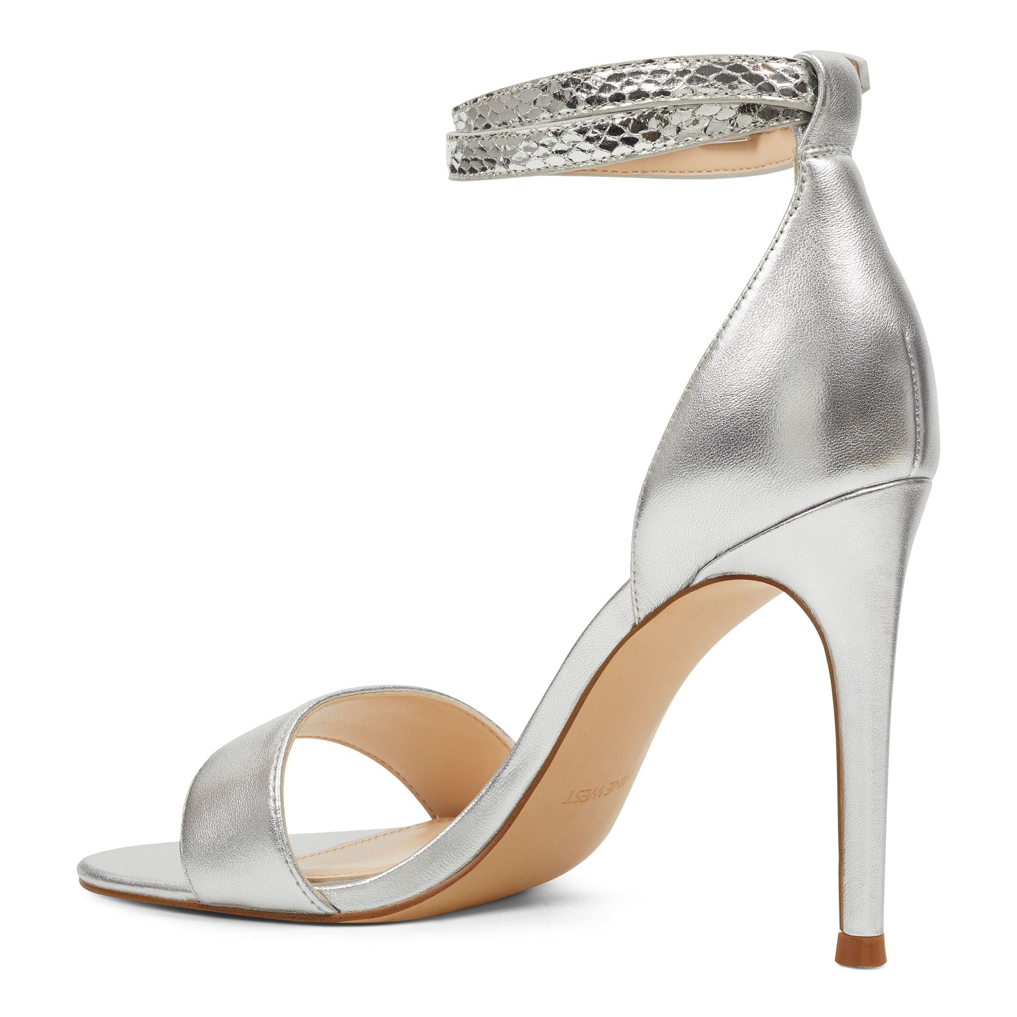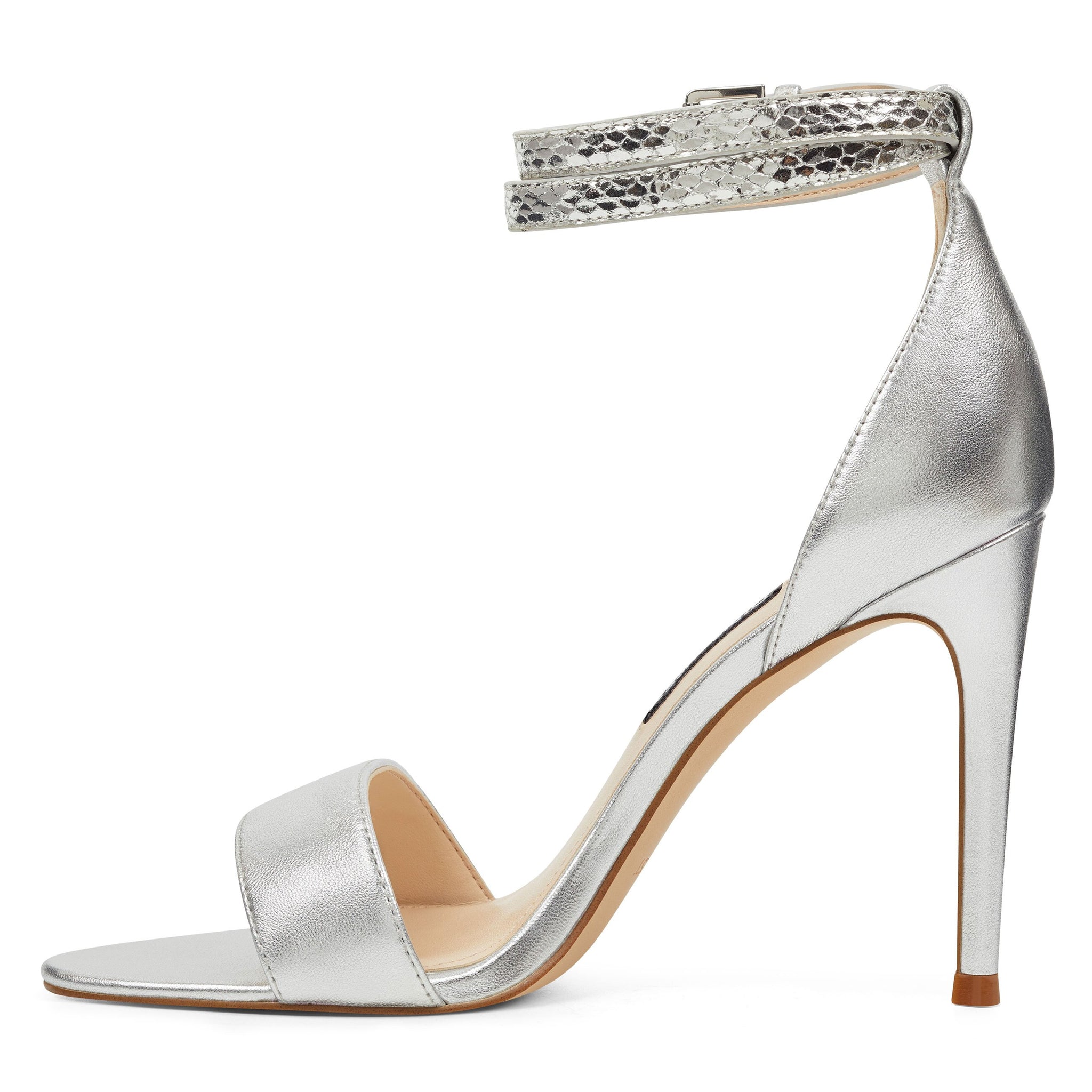 A lofty adjustable, snake-embossed ankle strap is offset by a pretty open-toe on our Nika sandals lifted by an impressive 4 heel.