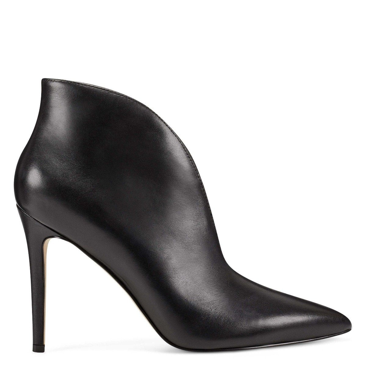 A plunging topline dramatizes out Tetty contemporary pointy-toe bootie counterbalanced by a sleek stiletto heel.