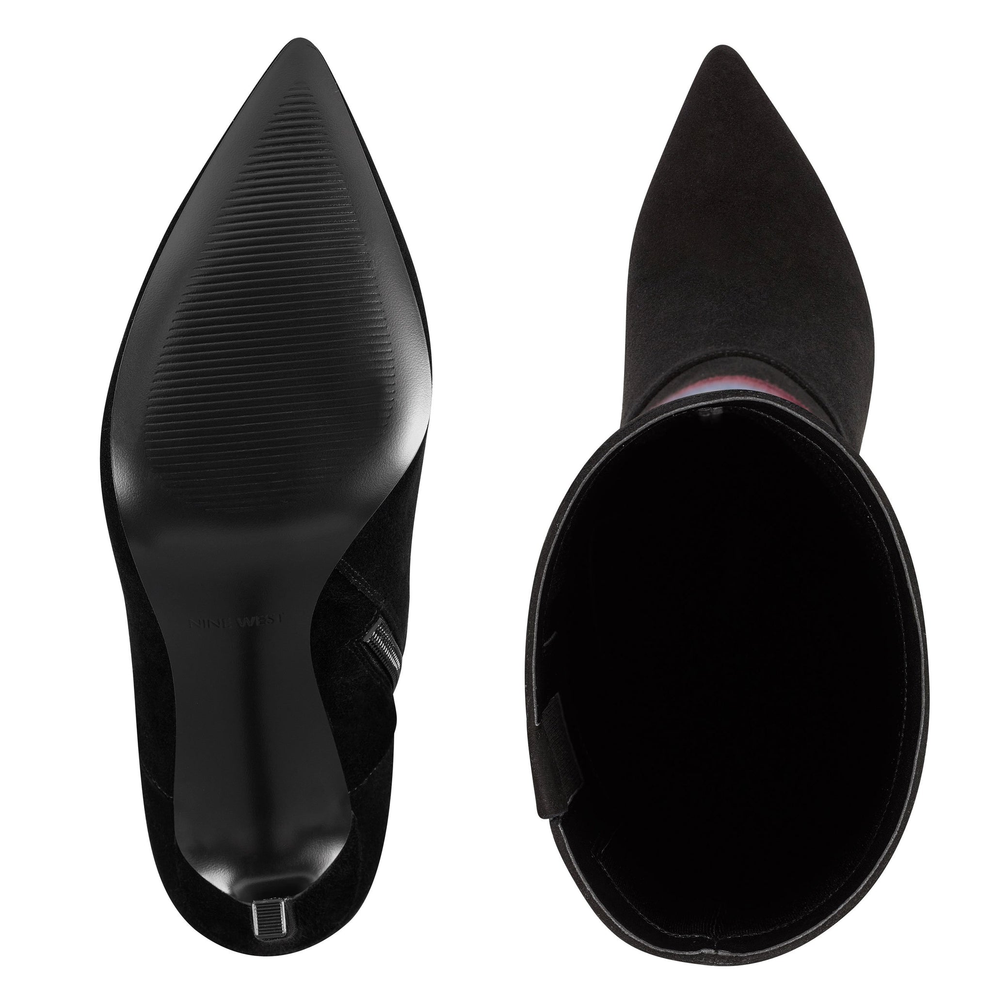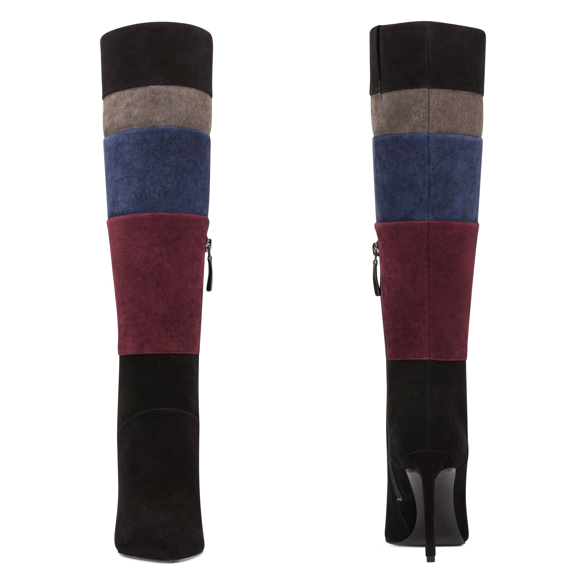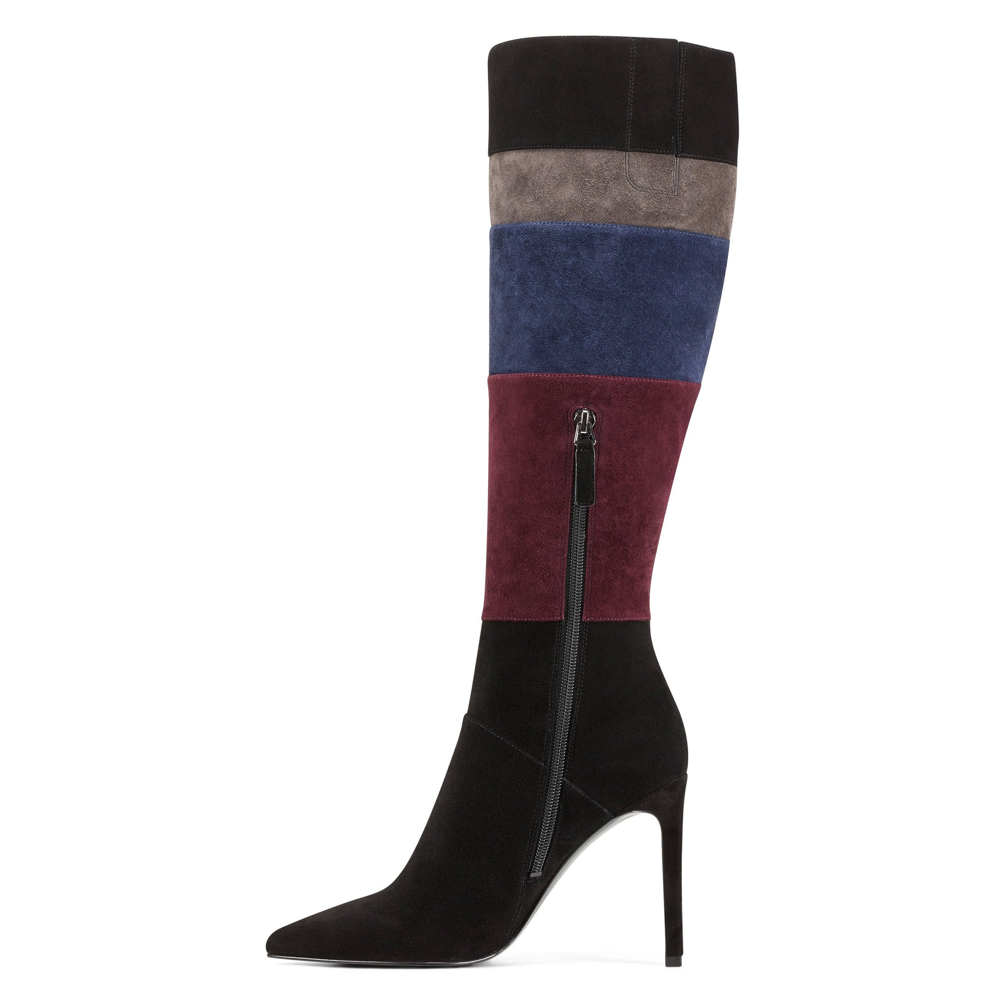 Navy, steel, black and brown suede color our eye-catching Toprank knee-high boots. A leg-lengthening pointy toe is counterbalanced by a 4" stiletto heel. A side zipper makes it easy to slip Toprank on and off.